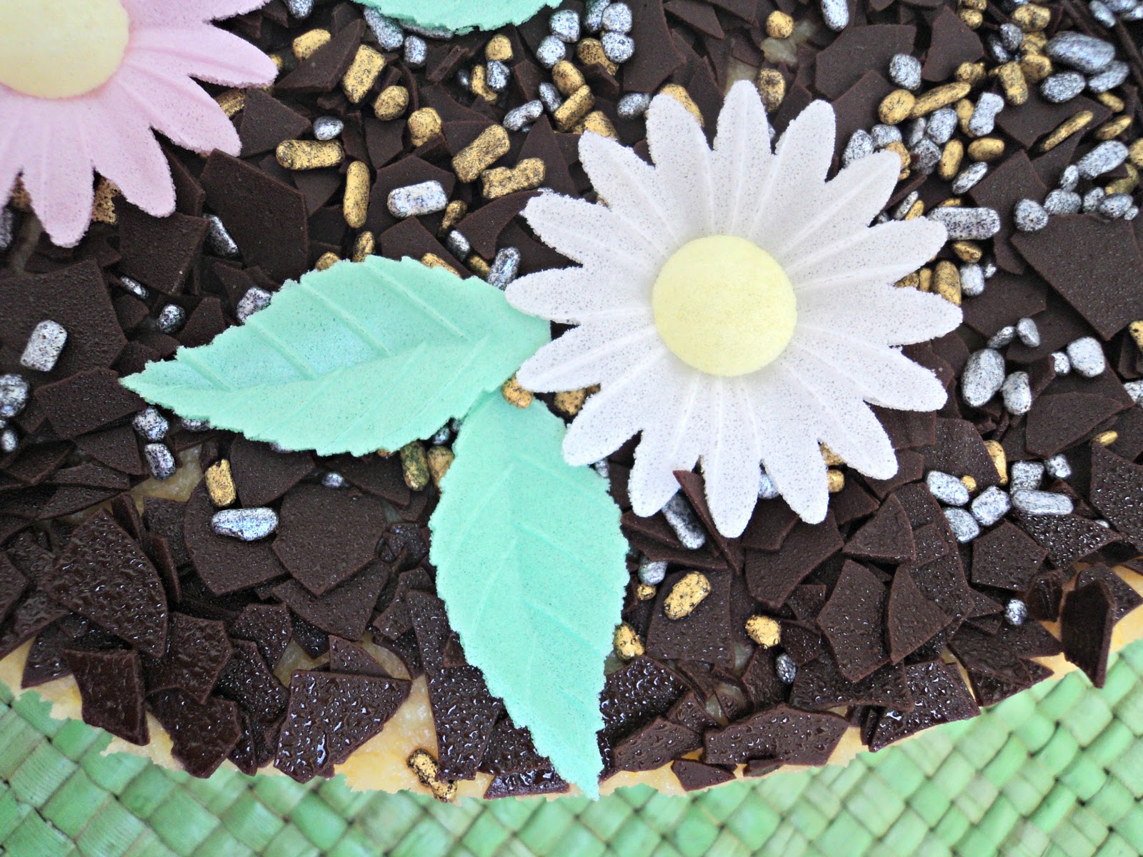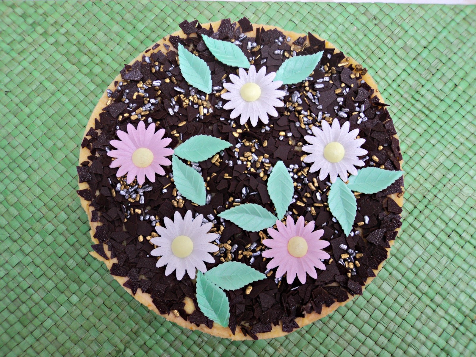 - Adornamos en este caso poniendo virutas de chocolate por toda la superficie, sobre ellas perlitas de azúcar y terminamos con las margaritas de obleas.