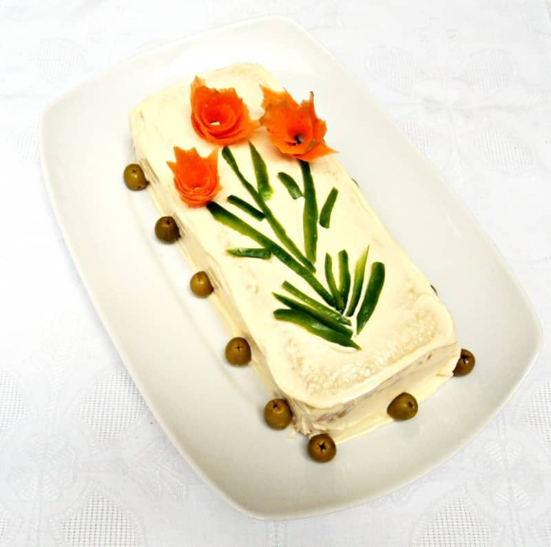 - Al día siguiente, lo ponemos sobre la bandeja de servir, quitamos el molde, el film con cuidado y decoramos, para ello lo he cubierto con mahonesa, adornamos con unas tiras de pimiento y zanahorias simulando unas flores, aceitunas en el borde y listo para servir.