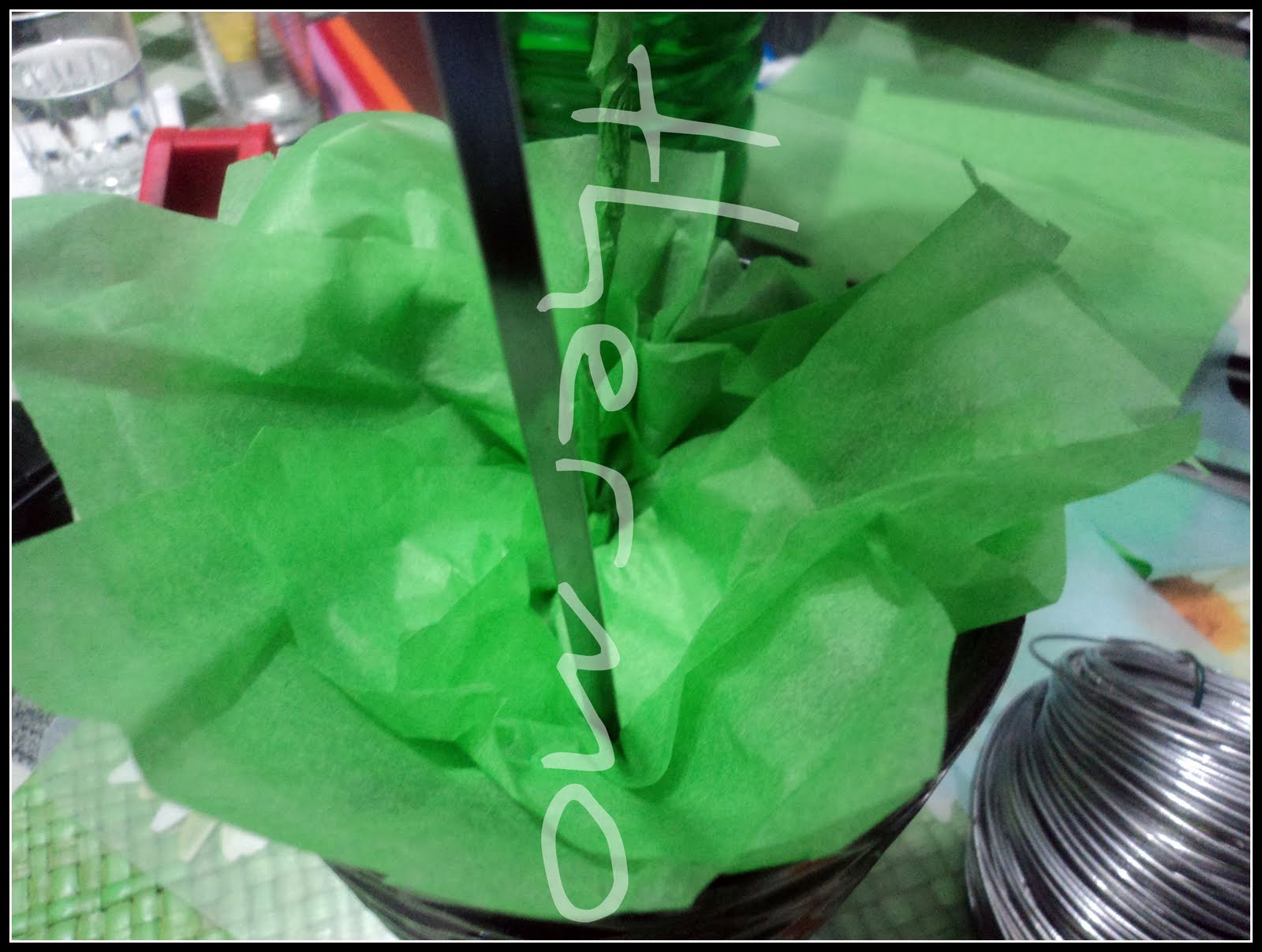 Hacer 8 rectángulos de papel de seda verde. Ir disponiéndolos sobre la maceta de manera que al fijarlos a la esponja se queden como picos semejando las hojitas de la maceta. Luego no se verán pero quedará mejor.