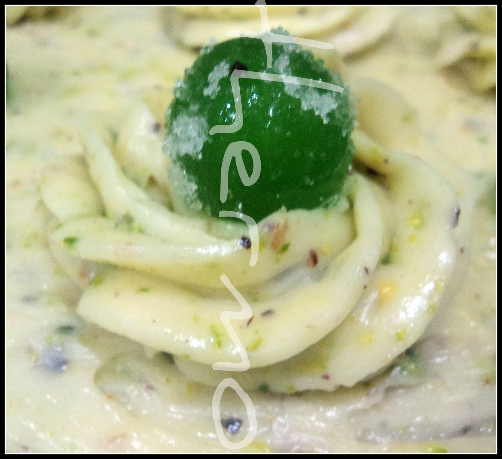 Cubrir toda la tarta con la crema de mantequilla al aroma de vainilla y pistachos.