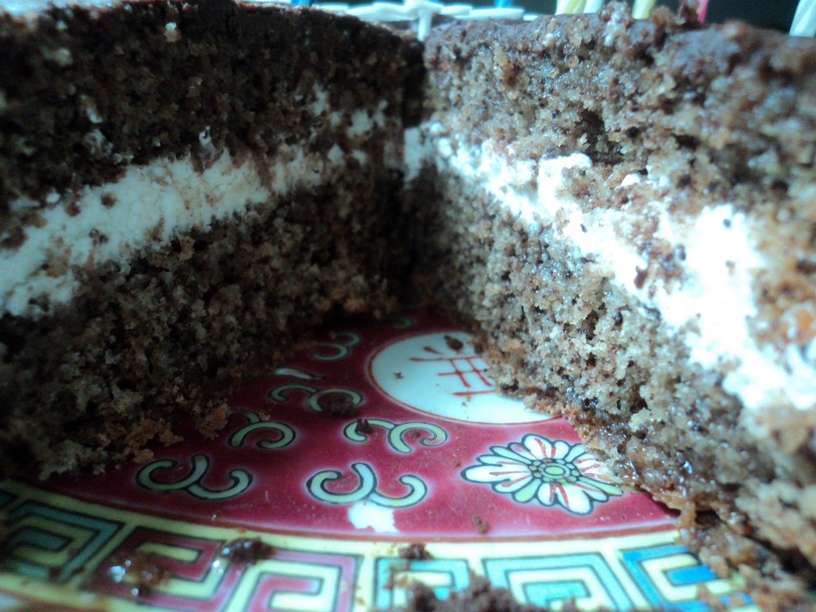 He preparado un bizcocho de chocolate sin pistachos, lo dividí en dos y calé con abundante almíbar ligero.