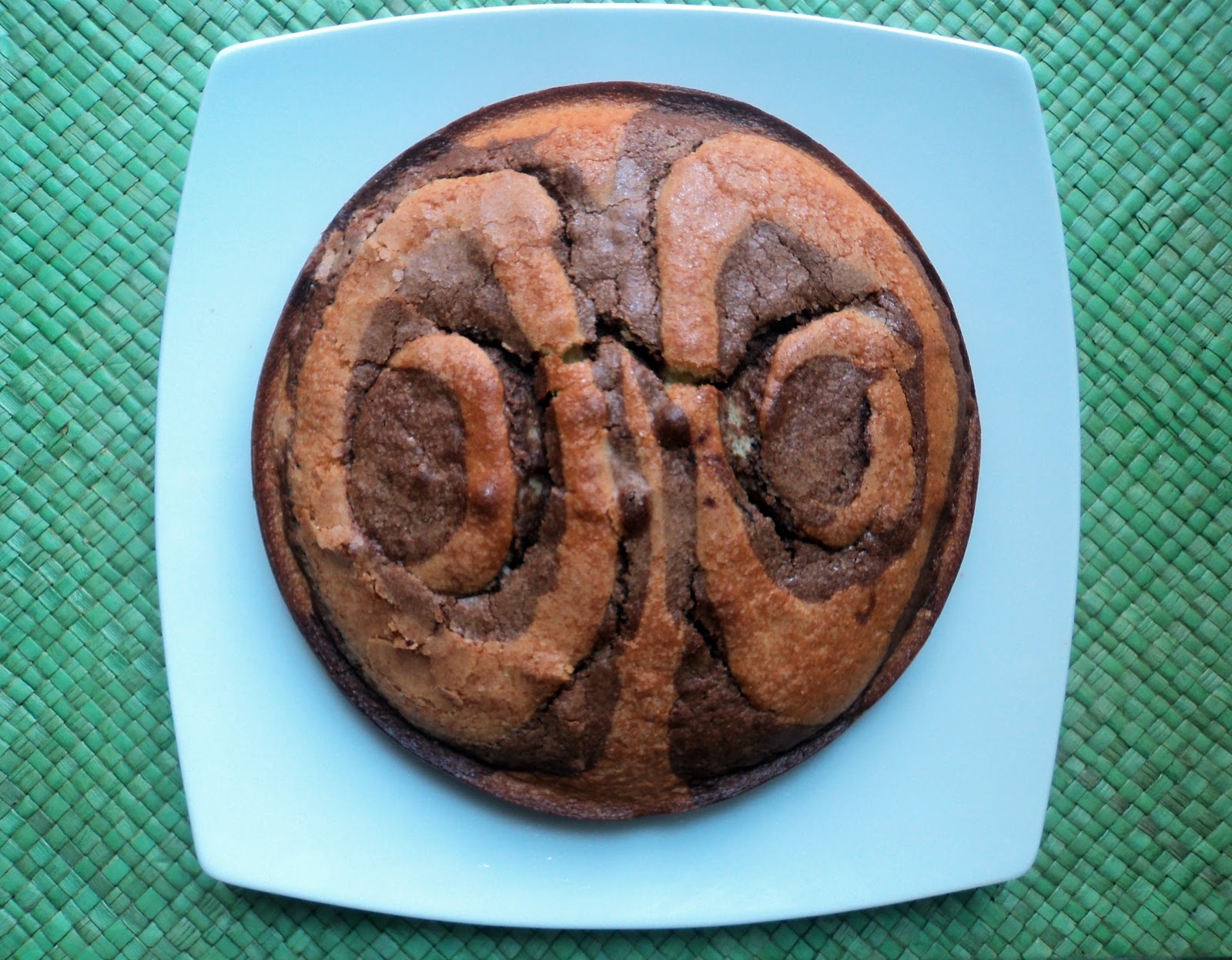 - Engrasamos un molde redondo desmontable, tomamos las dos masas y ponemos una base de masa blanca, después unas cucharadas a cada lado de masa de chocolate, damos unos golpes suaves a los lados para que la masa se vaya hacia el centro.