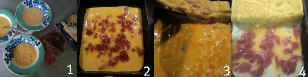 - Pincelamos nuevamente y echamos el segundo huevo, esta vez con el queso. Levantamos un poco el rollo que ya tenemos hecho para que se unan ambos huevos y continúe el rollo. Podemos enrollar hacía el otro lado o dar la vuelta a la sartén que fue lo que hice yo y me fue más fácil. (Foto 3)