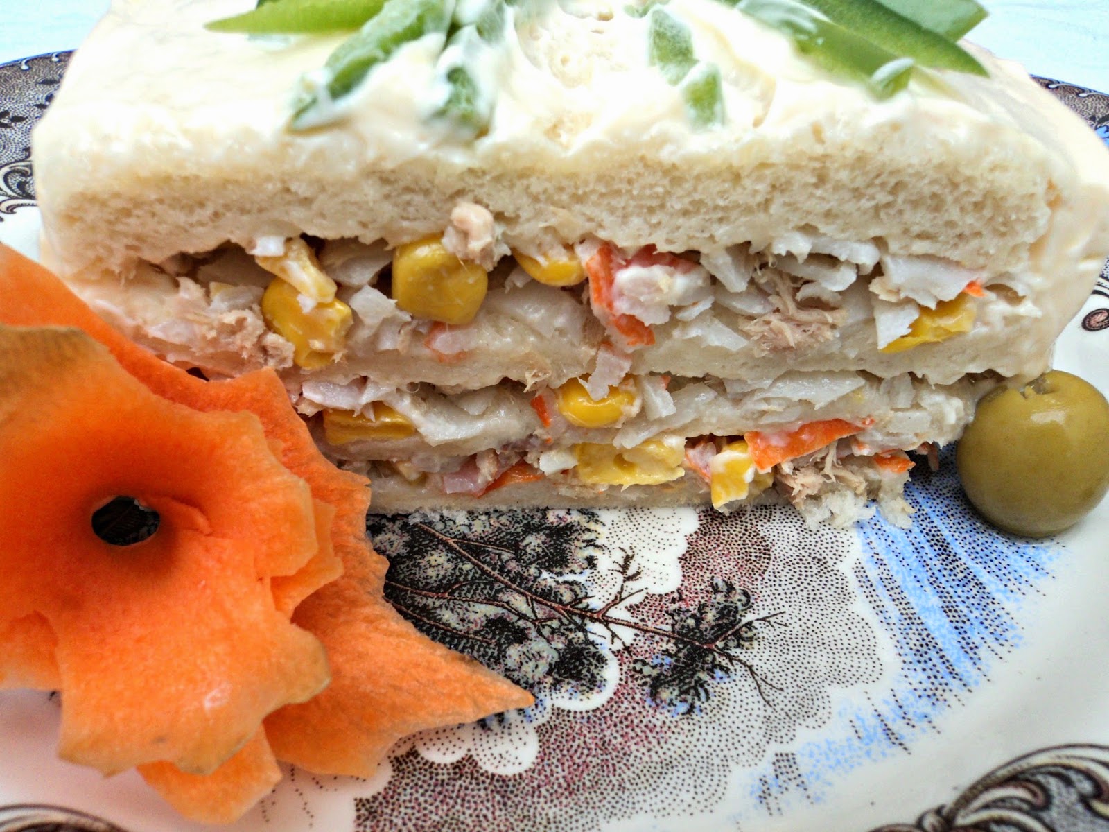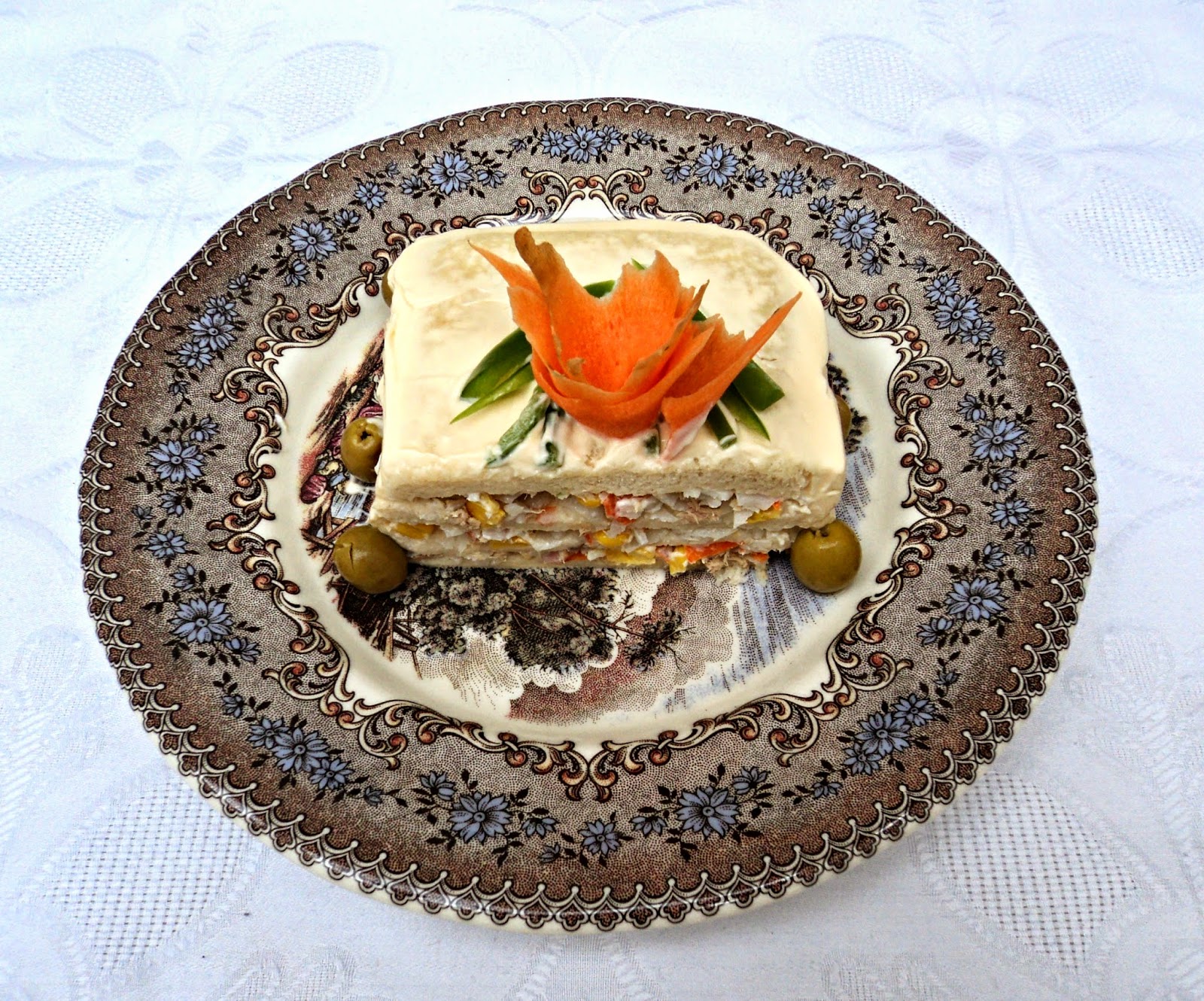 - Al día siguiente, lo ponemos sobre la bandeja de servir, quitamos el molde, el film con cuidado y decoramos, para ello lo he cubierto con mahonesa, adornamos con unas tiras de pimiento y zanahorias simulando unas flores, aceitunas en el borde y listo para servir.