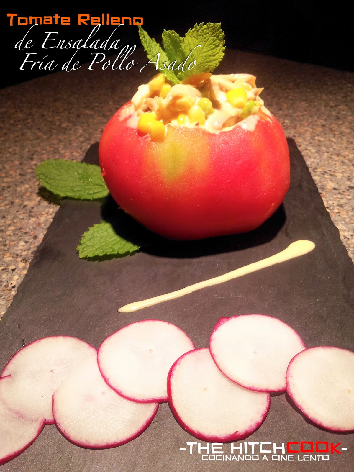 Tomate relleno de ensalada fría de pollo asado de The Hitchook, platos de cosas rellenas