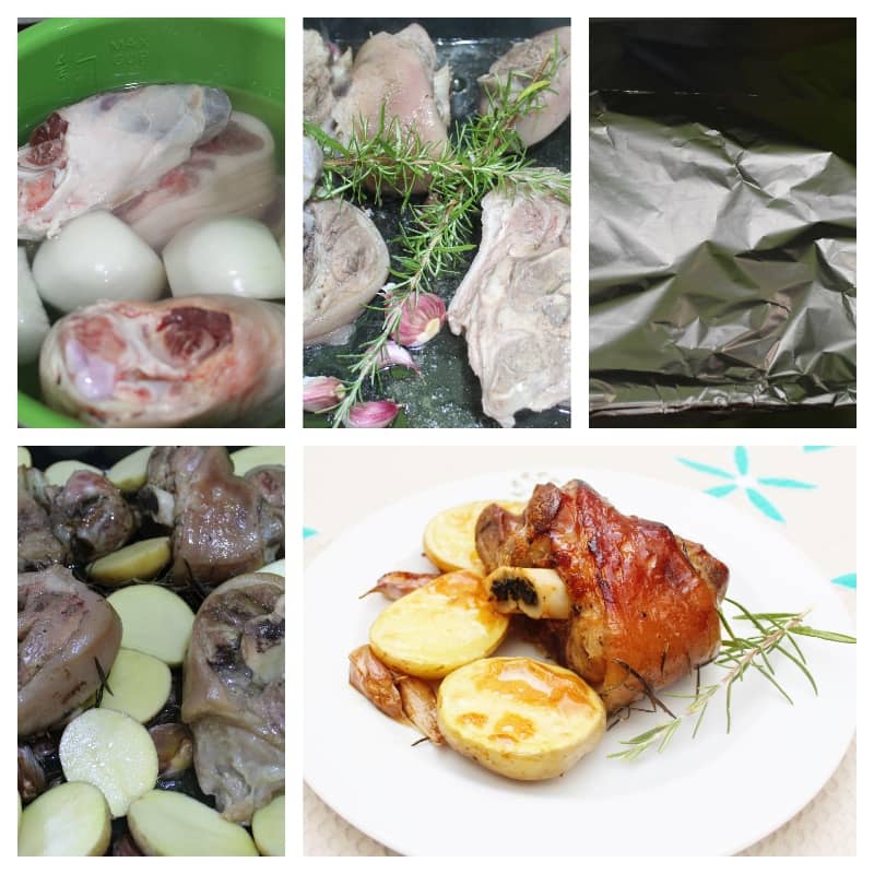 - Cuando falte media hora, lavamos y secamos bien las patatas, las partimos por la mitad y añadimos a la fuente junto a dos cucharones del agua de cocer los codillos. Volvemos a tapar la fuente.